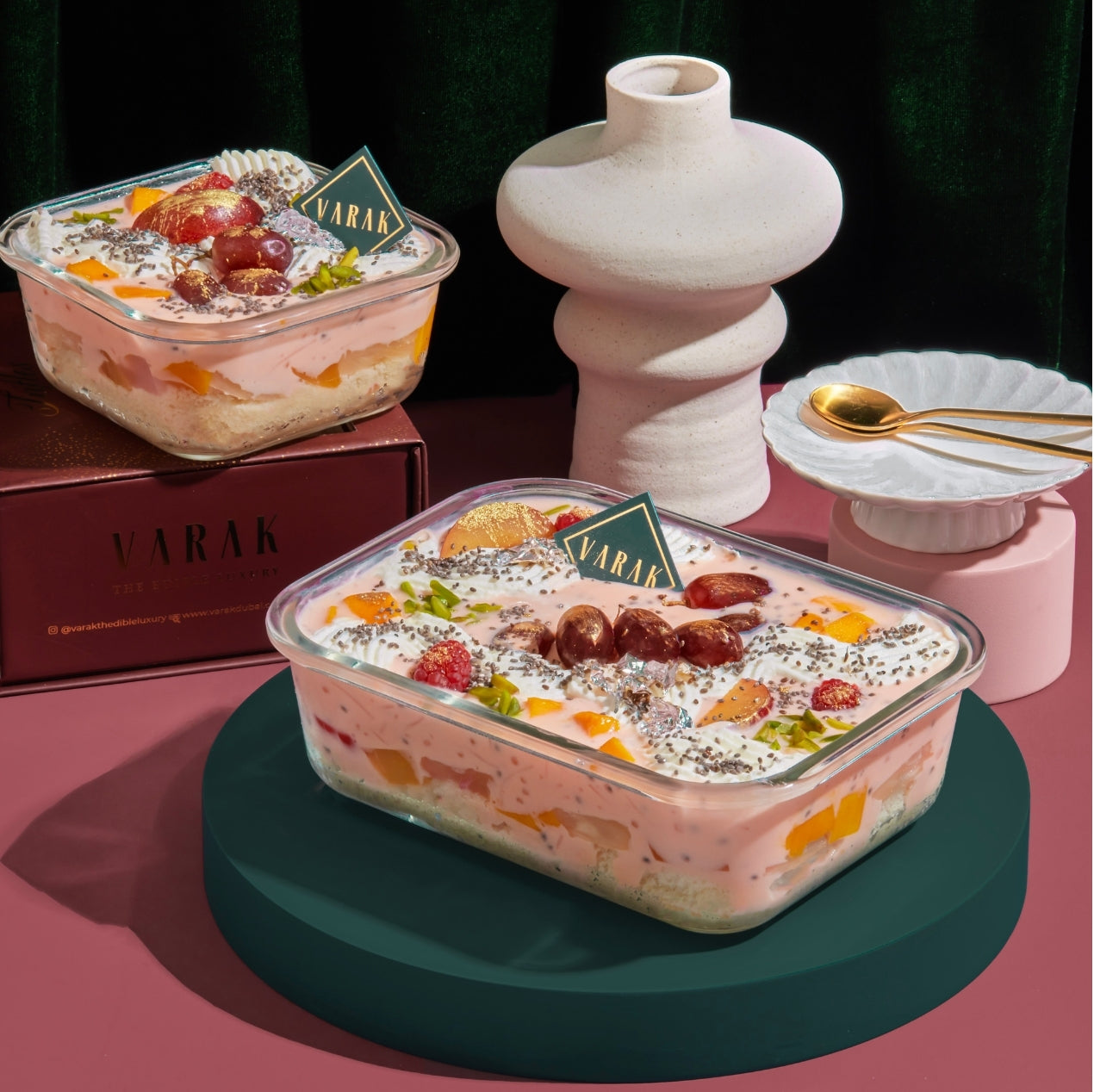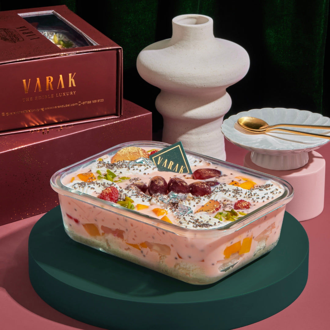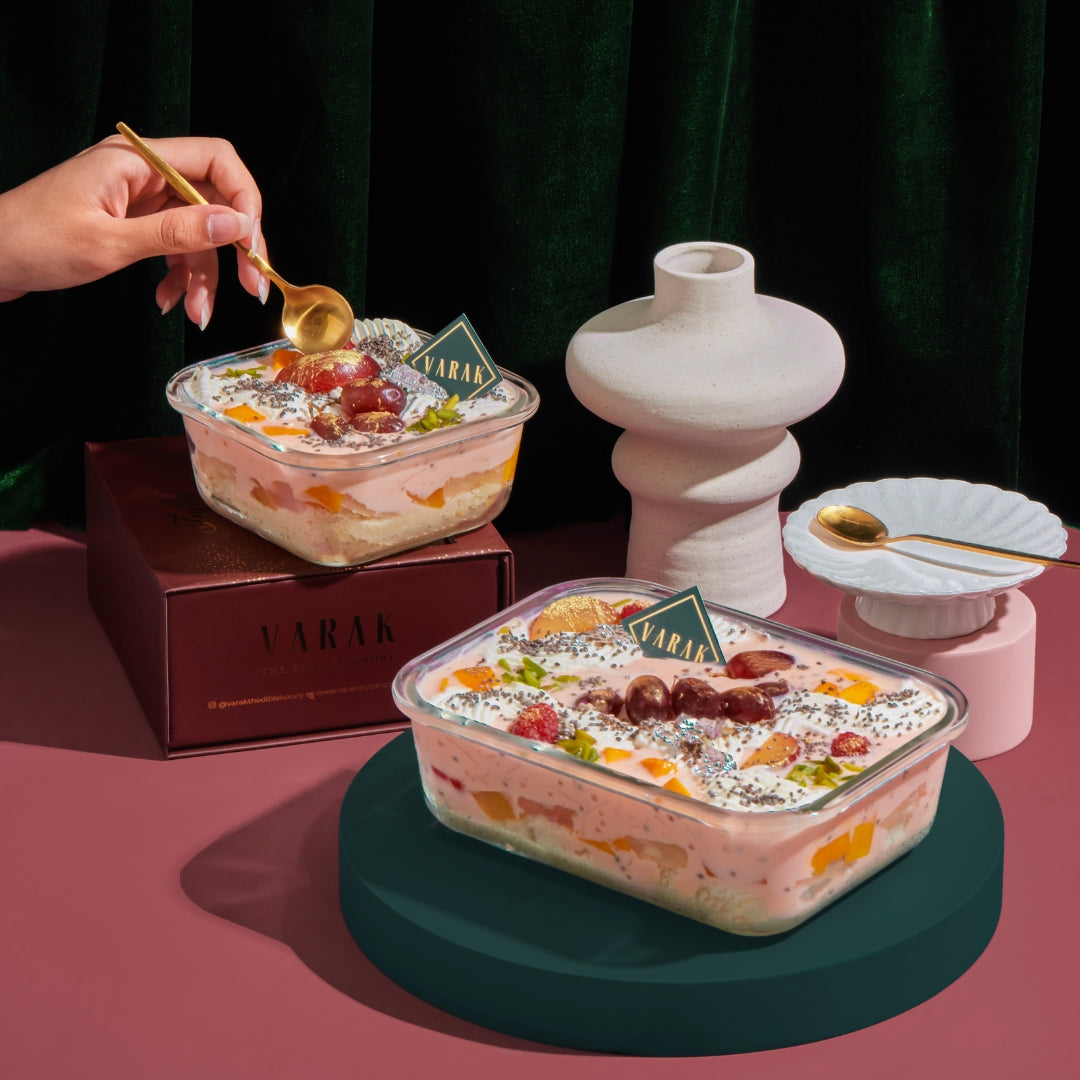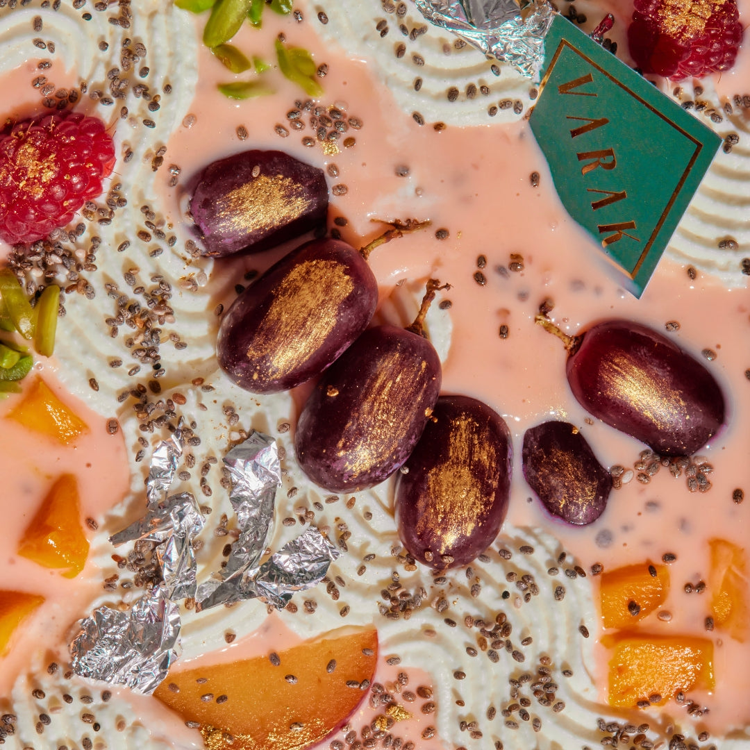 A beautiful fusion of Persian elegance and South Asian nostalgia! Rooted in Iran, the classic rose & vanilla milkshake with vermicelli and basil seeds meets the beloved fruit custard of South Asia. Our Varak touch brings these two rich culinary traditions together in one indulgent treat!