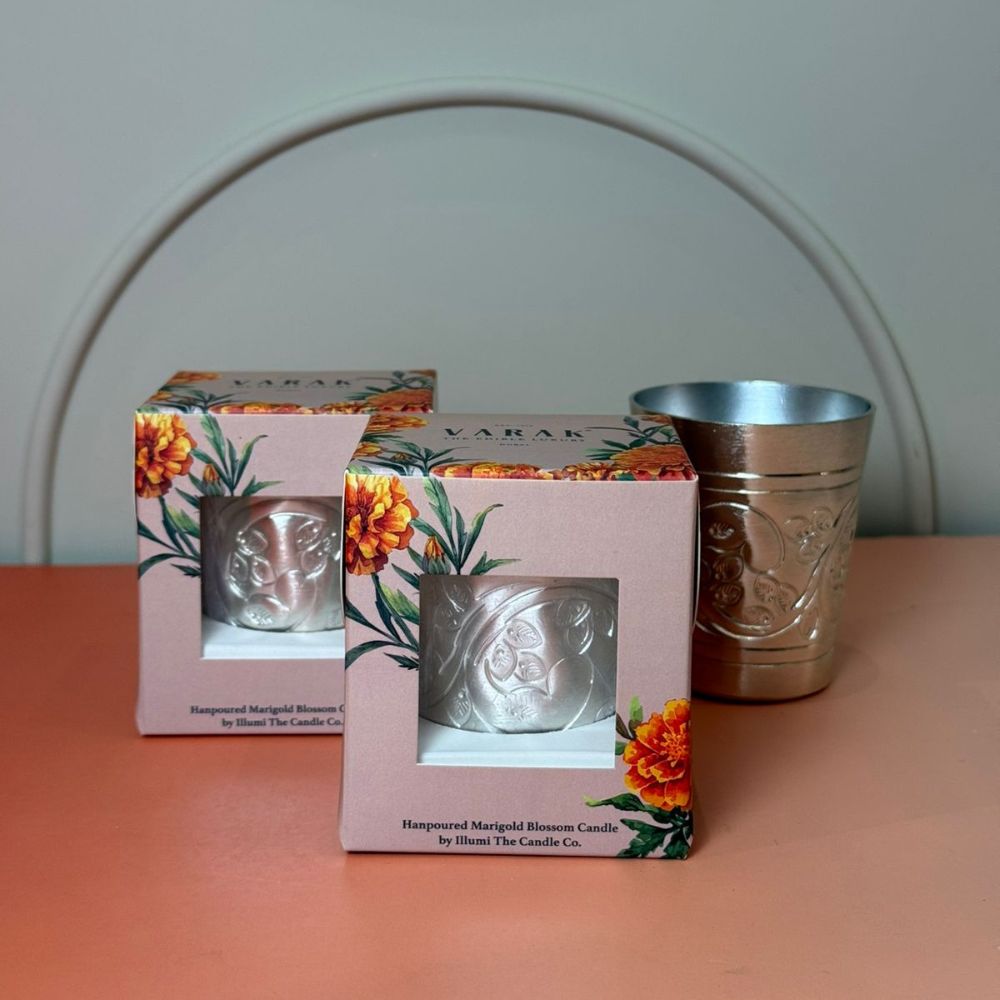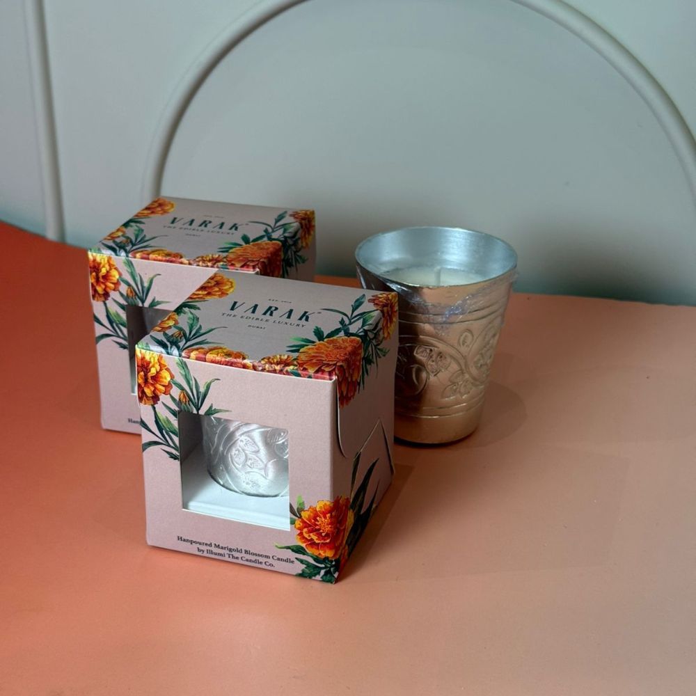 Hand-poured with pure soy wax, this elegant candle is set in a beautifully embossed metallic holder that adds a touch of luxury to any space. Infused with the uplifting fragrance of Marigold Blossom, it carries delicate notes of marigold, grounding vetiver, fresh neroli, and warm amber, creating a soothing yet vibrant aroma.
