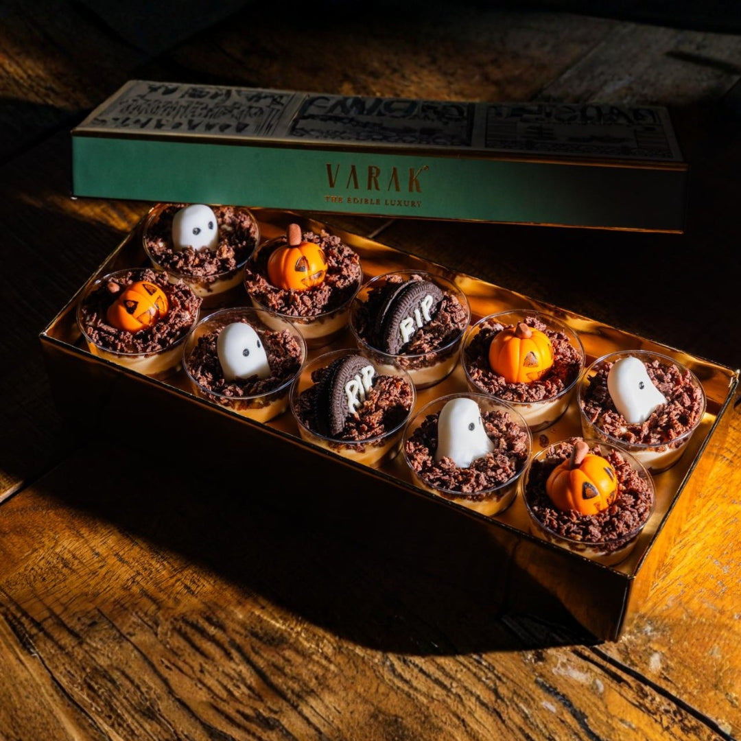 Layers of silky cream, chocolate crumble, and spooky toppers — mini ghosts, pumpkins, and gravestone cookies — all come together in this Halloween-exclusive trifle box. Each cup is crafted to look like a mini haunted graveyard but tastes like heaven.